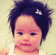Fiona was born with a head full of hair and a natural pixie cut. After her first bath, her hair decided to stick up and nothing would tame it. She looked like a porcupine! Only when her hair was long enough that it got heavier, it went down (around four months). Fiona's hair has always gotten her lots of compliments!